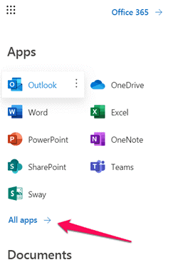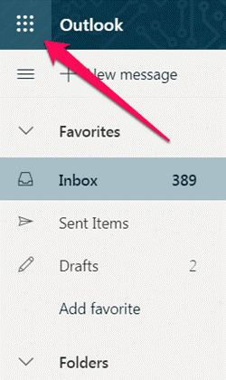 - Em seguida, clique no botão junto à etiqueta do Outlook. Este parece um quadrado composto por nove pontos. Assim que tenha acionado o botão, aparecerá uma nova janela instantânea. Esta exibirá a lista de aplicações incluídas no pacote do Office 365 e que terá à sua disposição;