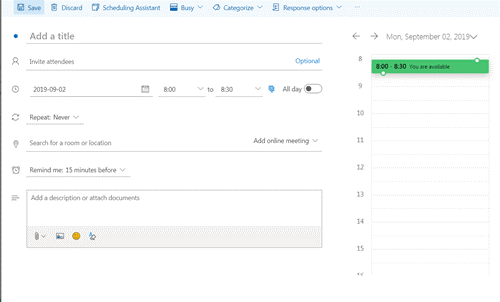 - Para alterar a localização de um evento específico no calendário do Outlook, clique simplesmente no campo «Pesquisar uma sala ou localização» e escreva a localização que pretende definir. A interface intuitiva irá sugerir diferentes opções, de acordo com as localizações que tenha definido previamente. Poderá digitar o nome de determinada cidade, rua, restaurante, hotel ou qualquer outro local. Se a interface encontrar o local por si definido, este ficará guardado para o seu próximo evento do Outlook Calendar.